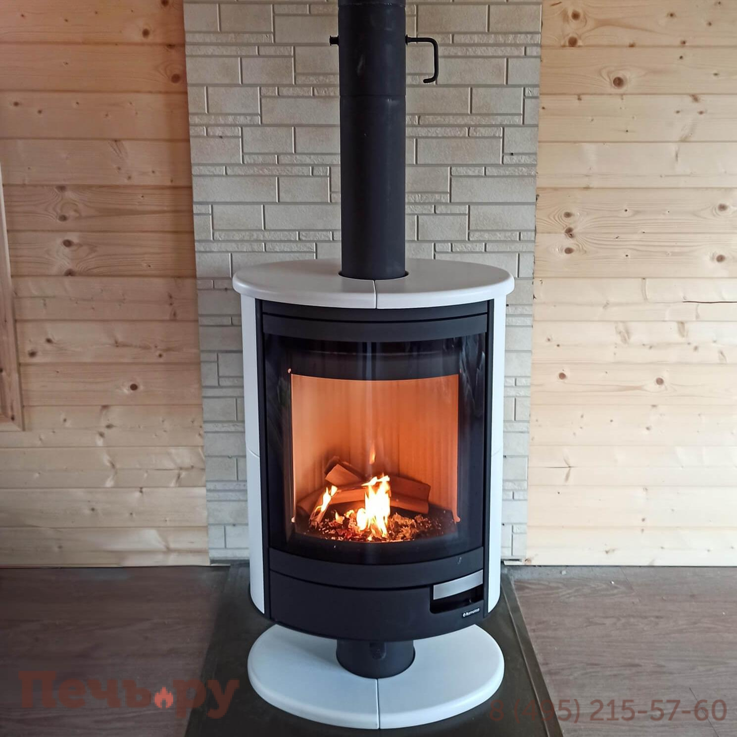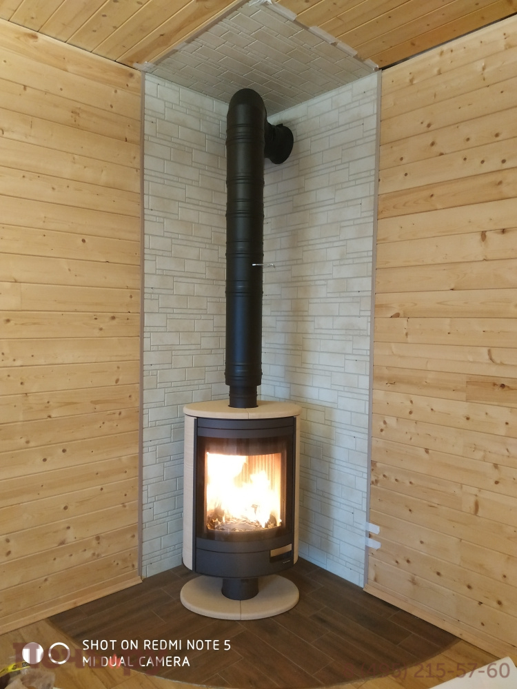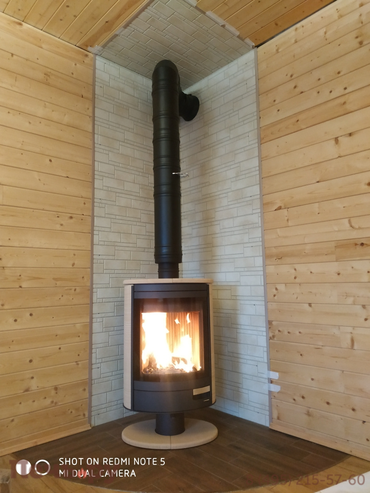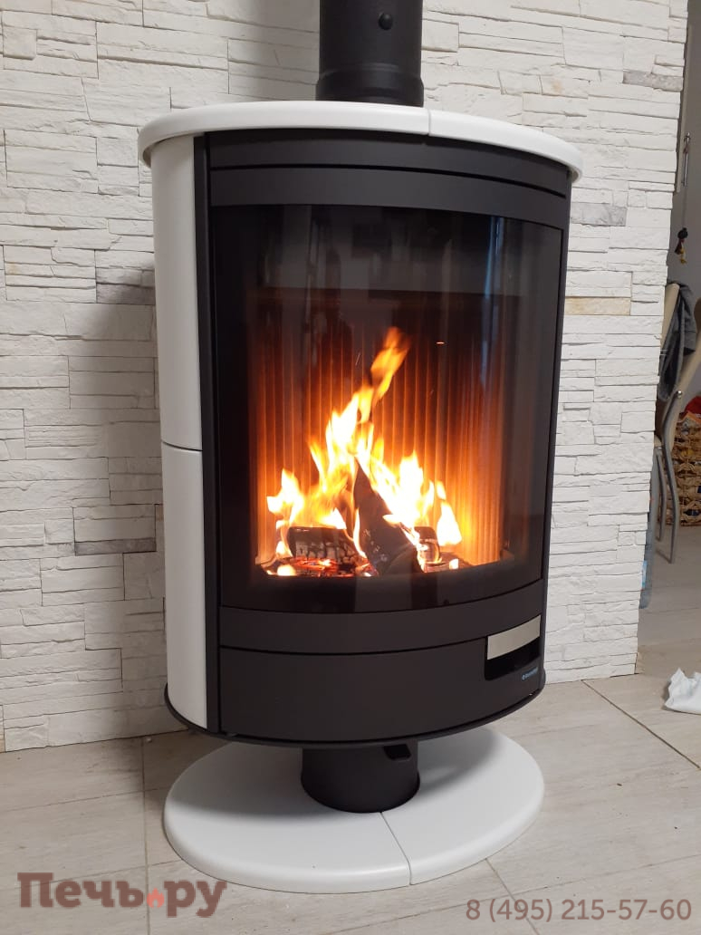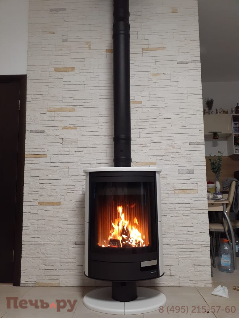 Топка вращается вокруг дымохода, поэтому он подключается только сверху. Диаметр дымохода распространённый – 150 мм. Печь-камин N спроектирована как пристенная, но при желании вы можете поместить её в центр комнаты и смотреть на огонь с разных точек пространства. Вертите топку, как нужно: фасадом то к столу с гостями, то к дивану или креслу, то к входу в помещение. И всякий раз огонь будет восприниматься по-новому. Возможность поворачивать камин придётся очень по вкусу любителям перестановок.